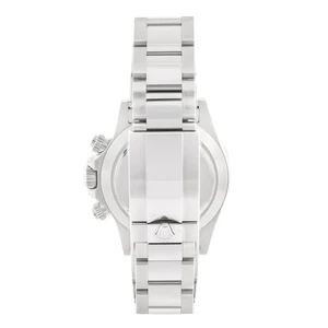 The Rolex Daytona ref. 116500LN. This highly sought-after Rolex is the 40mm case size model, which was discontinued in 2023. It features a black ceramic bezel and a black dial with silver rim sub-dials. This Daytona comes fitted with a stainless steel Oyster bracelet and an Oysterlock clasp.
